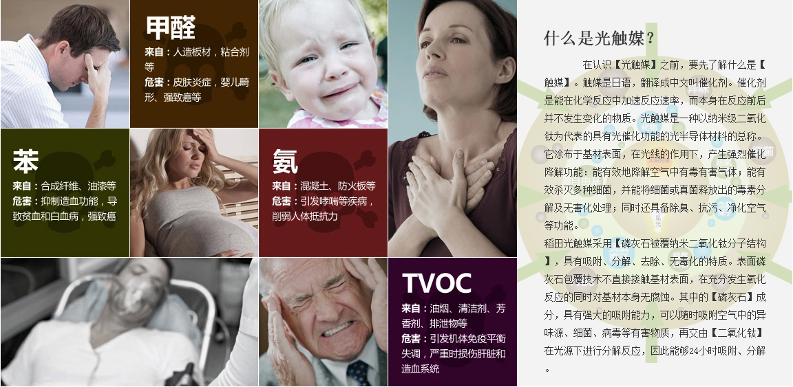 在認(rèn)識(shí)【光觸媒】之前,要先了解什么是【觸媒】。觸媒是日語,翻譯成中文叫催化劑。催化劑是能在化學(xué)反應(yīng)中加速反應(yīng)速率,而本身在反應(yīng)前后并不發(fā)生變化的物質(zhì)。光觸媒是一種以納米級(jí)二氧化鈦為代表的具有光催化功能的光半導(dǎo)體材料的總稱。它涂布于基材表面,在光線的作用下,產(chǎn)生強(qiáng)烈催化降解功能:能有效地降解空氣中有毒有害氣體;能有效殺滅多種細(xì)菌,并能將細(xì)菌或真菌釋放出的毒素分解及無害化處理;同時(shí)還具備除臭、抗污、凈化空氣等功能。 稻田光觸媒采用【磷灰石被覆納米二氧化鈦分子結(jié)構(gòu)】,具有吸附、分解、去除、無毒化的特質(zhì)。表面磷灰石包覆技術(shù)不直接接觸基材表面,在充分發(fā)生氧化反應(yīng)的同時(shí)對(duì)基材本身無腐蝕。其中的【磷灰石】成分,具有強(qiáng)大的吸附能力,可以隨時(shí)吸附空氣中的異味源、細(xì)菌、病毒等有害物質(zhì),再交由【二氧化鈦】在光源下進(jìn)行分解反應(yīng),因此能夠24小時(shí)吸附、分解